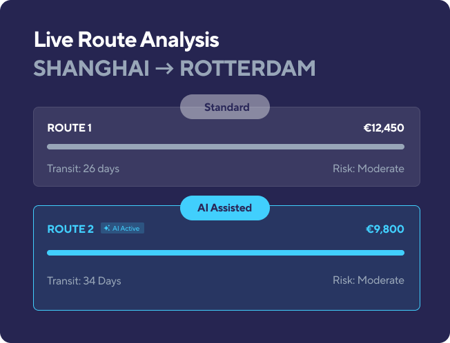 Optimize your global freight forwarding with real-time AI insights, predictive route modeling, and automated cost reduction.